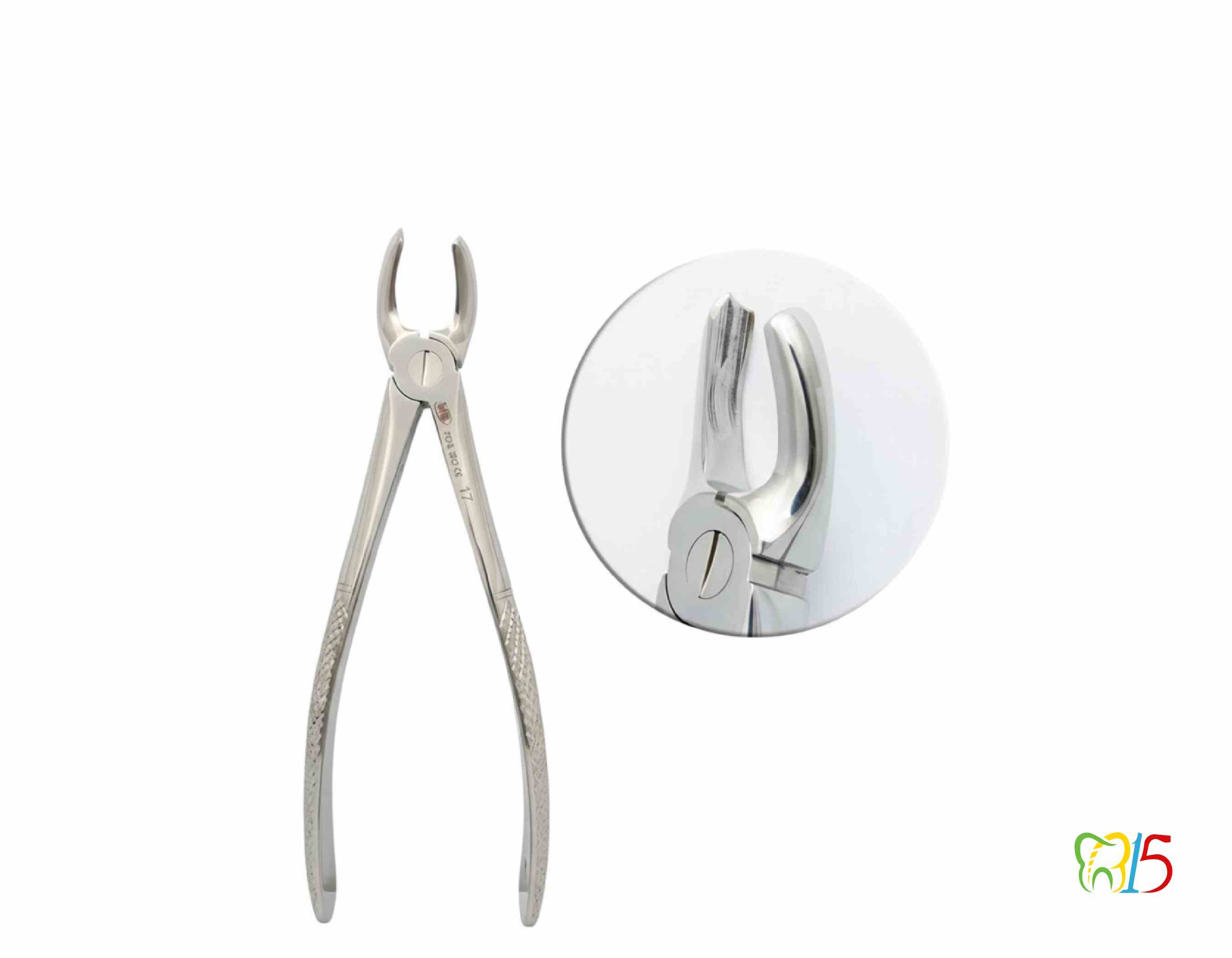 این فورسپس دارای یک فک نوکتیز و یک فک گرد است. تیغه نوکتیز (Spike) آن برای قرارگیری در محل انشعاب (فورکاسیون) ریشههای سمت باکال (گونهای) و فک گرد آن برای دربرگرفتن ریشه پالاتال (کامی) استفاده میشود. این فورسپس دقیقاً قرینه فورسپس مولر بالا چپ است و برای دندانهای مولر اول و دوم راست فک بالا کاربرد دارد. انحنای دسته آن به سمت راست است تا ارگونومی کار جراح بهبود یابد.