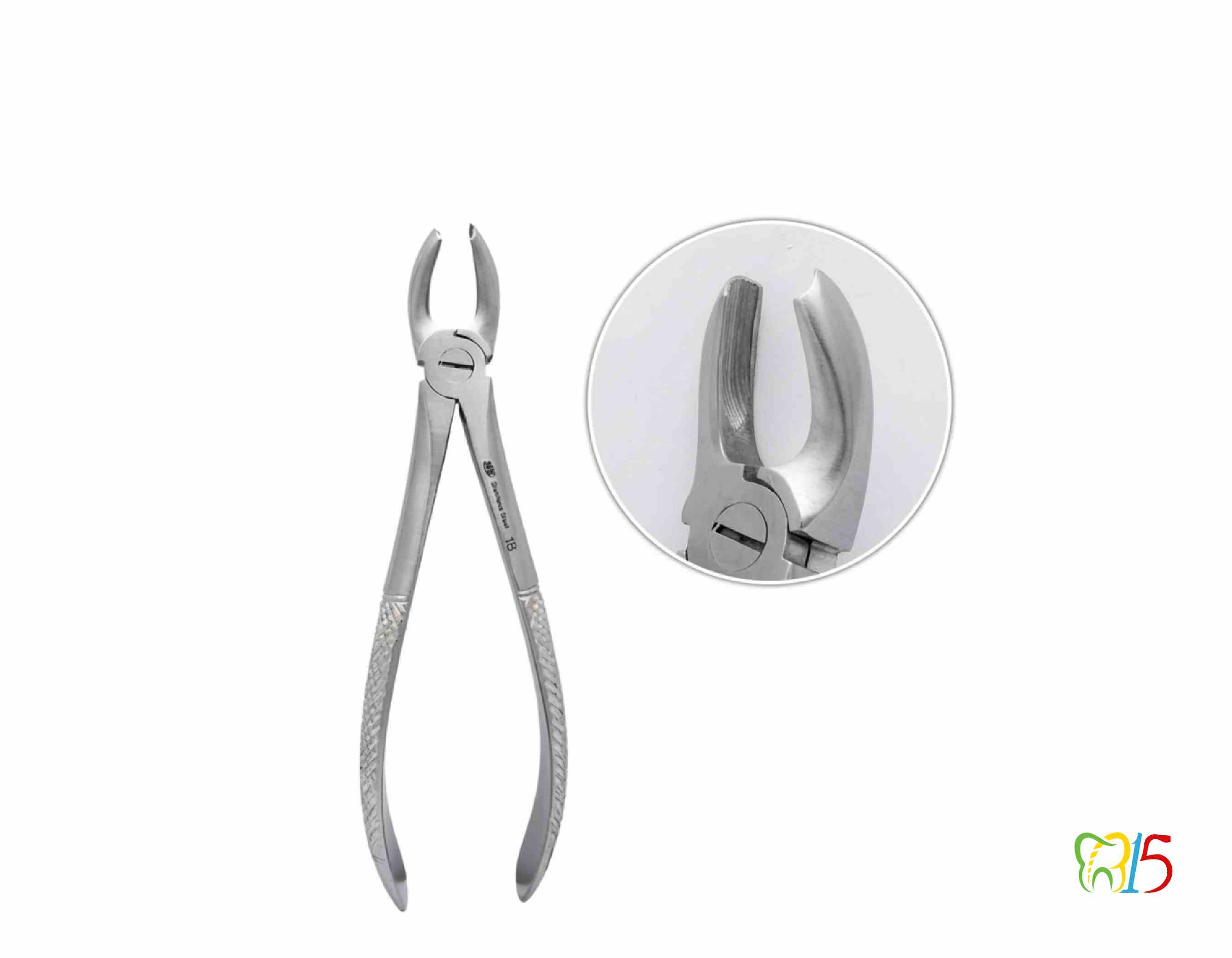 این فورسپس دارای یک فک نوکتیز و یک فک گرد است که با توجه به آناتومی دندانهای مولر بالا (ریشههای باکال و پالاتال) طراحی شده است. فک نوکتیز (Spike) آن برای قرارگیری در محل انشعاب ریشههای سمت باکال (گونهای) و فک گرد برای دربرگرفتن ریشه پالاتال (کامی) استفاده میشود. انحنای این فورسپس به گونهای است که دست جراح هنگام کار روی دندانهای عقب فک بالا در سمت چپ، از دهان بیمار خارج شده و دید کافی فراهم شود.