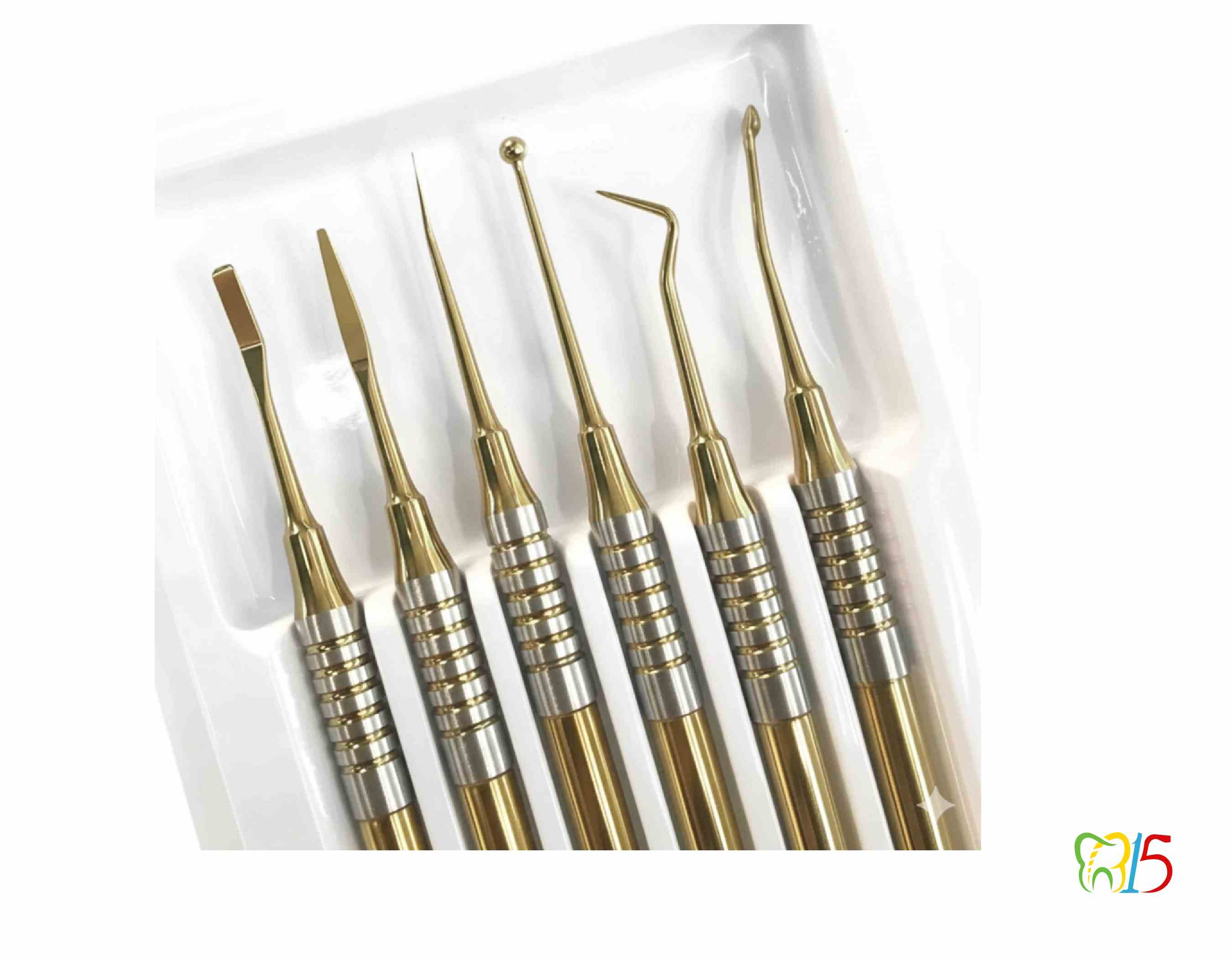 ست ۶ عددی قلم کامپوزیت طلایی شامل مجموعه ابزارهایی است که دندانپزشکان برای برداشتن، قرار دادن، شکل‌دهی و کانتورینگ (فرم دادن) مواد رزین کامپوزیت (چه در ترمیم‌های خلفی و چه قدامی) از آن استفاده می‌کنند. ویژگی کلیدی این ابزارها، روکش طلایی رنگ آنهاست که معمولاً از جنس تیتانیوم نیترید (Titanium Nitride - TiN) یا پوشش‌های خاص ضد چسبندگی دیگر است. این روکش، خاصیت Non-Stick (عدم چسبندگی) ایجاد کرده و باعث می‌شود مواد کامپوزیت به راحتی از سطح قلم جدا شده و دندانپزشک بتواند با دقت و سرعت بیشتری کامپوزیت را در حفره یا روی سطح دندان شکل دهد. این ست دارای ۱۲ نوک مختلف (دو سر بودن هر قلم) با اشکال گوناگون (مانند پدلی، قاشقی، کندانسور و صاف) است که تمام مراحل زیبایی و ترمیمی با کامپوزیت را پوشش می‌دهد.
