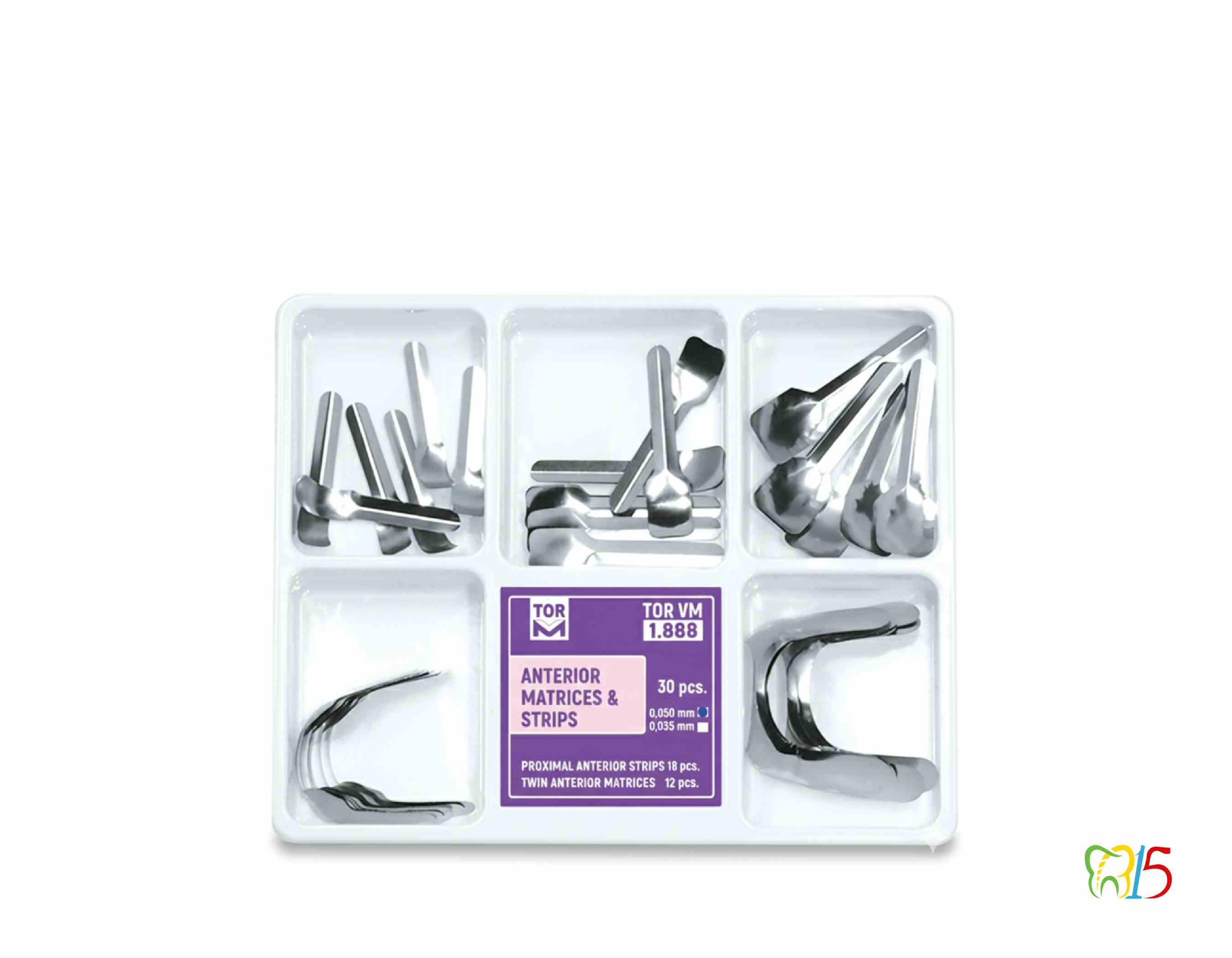 کیت ماتریکس و نوارهای قدامی، مجموعهای از نوارهای فلزی یا شفاف از پیششکل داده شده با ضخامت بسیار کم (اغلب حدود ۵۰ میکرون) هستند که منحصراً برای ترمیمهای مستقیم دندانهای جلویی طراحی شدهاند. این کیتها شامل انواع مختلفی از نوارها و ماتریکسها مانند نوار پرفروکسیمال قدامی و ماتریکسهای دوقلو میباشند که هر کدام برای ترمیم نواحی خاصی نظیر سطوح پروگزیمال و لبههای سرویکال دندانهای قدامی (کلاس III، IV و V) به کار میروند. شکل آناتومیک و کانتور شده این ماتریکسها به دندانپزشک امکان میدهد تا دیوارههای دندان را به طور دقیق بازسازی کرده، نقاط تماس مناسب را ایجاد نموده و یک ترمیم زیبایی با حداقل نیاز به سایش و پالیش نهایی را به دست آورد. این نوارها معمولاً دارای قوامی سفت و در عین حال انعطافپذیر هستند تا شکل خود را حفظ کرده و در حین کار کنترل بیشتری را فراهم آورند.